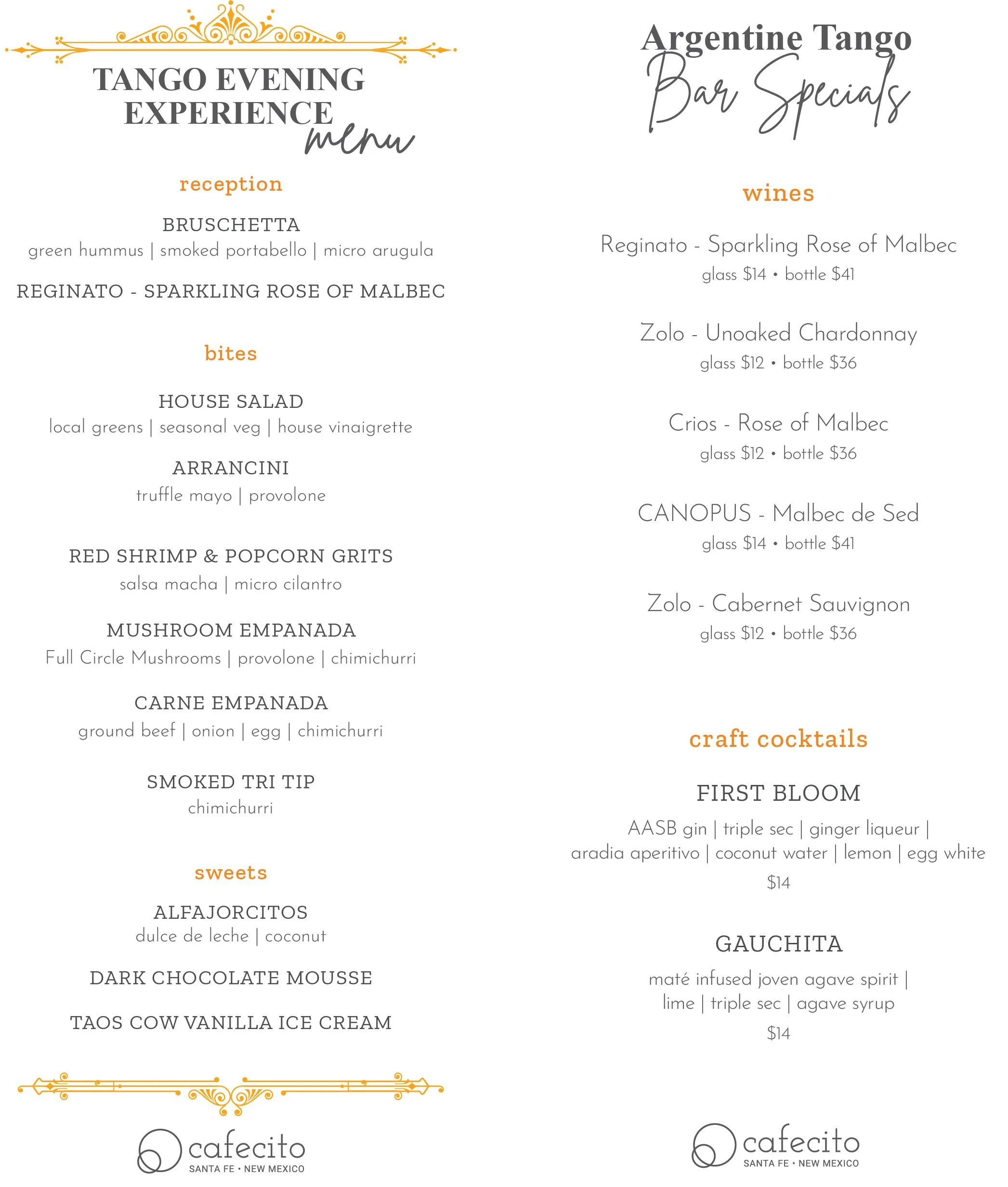 Cafecito invites you to an unforgettable Tango Evening Experience, featuring world-class Tango dancers Virginia Vasconi and Jaimes Friedgen. Immerse yourself in the vibrant culture of Argentina right here in Santa Fe, New Mexico, where international and local flavors blend seamlessly.